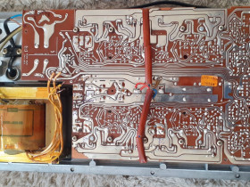 Hier ist die Einheit schon teilzerlegt, außerdem wurden die Verbindungen zum Netzkabel, zum Thermoschalter im Trafo und zum Signaleingang abgelötet. Zum Trennen der Platine vom Kühlkörper sind sechs Schrauben von der Rückseite her zu entfernen, platinenseitig sind es nochmals drei Stück. Dann zeigt sich erstmals die Bestückungsseite. Ich war schon mal froh, dass das ohne Demontage jedes einzelnen Transistors funktioniert. Grundig hatte ein Herz für die Radio- und Fernsehmonteure der damaligen Zeit und hat zwei Kühlkörperbrücken vorgesehen, mit der die vielen Transistoren verschraubt sind. Diese lassen sich vom Rückwandkühlkörper lösen.