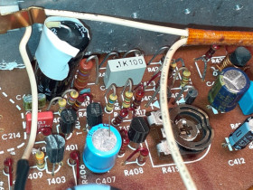 das Rauschen und Knistern konnte ich auf den Vorverstärker (T1/T2), den HT-Filter (T81-T83) oder deren Spannungsversorgung eingrenzen. Per Oszi sind die Knisterpeaks an der Basis und am Kollektor von T81, dem Eingangstransistor des HT-Filters nachweisbar. Legt man den Eingang des HT-Endverstärkers per Kondensator auf Masse, verschwinden Rauschen und Knistern. Außerdem sind sie auch da, wenn der Leistungsverstärker ausgeschaltet ist.